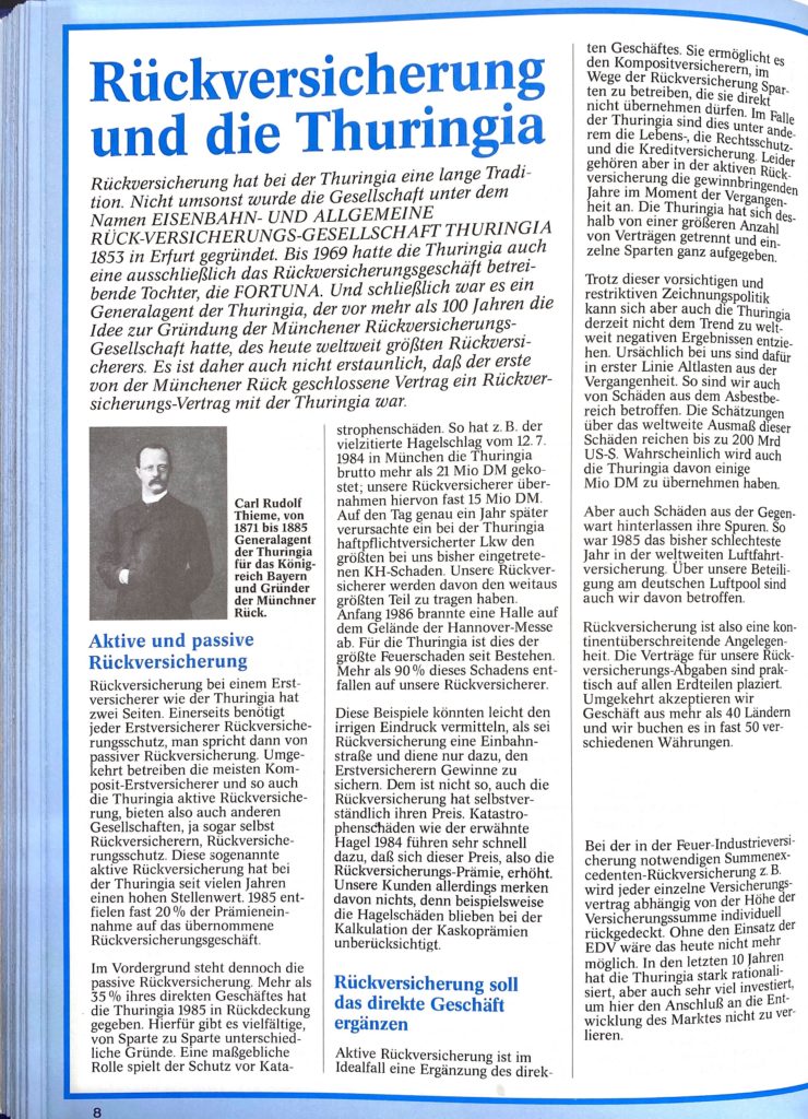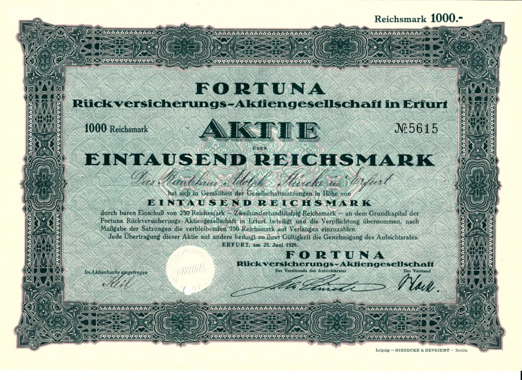 Namensaktie über 1000 RM vom 25. Juni 1929. Die Fortuna Rück übernahm Rückversicherungen in allen Zweigen. Die Fortuna Rück war auch berechtigt sich an anderen Versicherungsunternehmen zu beteiligen oder auch Versicherungsunternehmen zu erwerben. Die Fortuna Rück war eine Tochtergesellschaft der Thuringia Versicherung AG, Erfurt und gehörte somit auch zur Gruppe der Aachener und Münchener. Die Thuringia und Aachener und Münchener besaßen die Akien-Mehrheit an der Fortuna Rück. Mit der Thuringia bestand eine Personalgemeinschaft. 1946 wurde der Sitz der Fortuna Rück nach Hannover verlagert bzw. unmittelbar danach nach Hann. Münden. Im Jahr 1950 wurde der Sitz nach München verlegt. 1969 erfolgte der Übergang auf die Thuringia Versicherung AG (Abt. ZRV). 2003 erfolgte die Verschmelzung mit der SAVAG Saarbrücker Versicherung AG und Generali Lloyd Versicherung AG zur Thuringia Generali Versicherung AG.