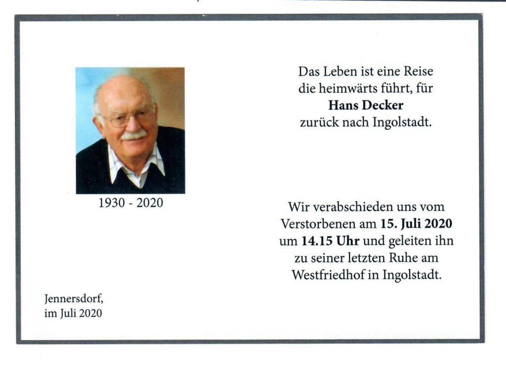 Dipl. Kfm. Hans Decker (*1930 – +2020) begann am 15.11.1954 in der Rechtsabteilung der Thuringia. Er leitete später die Verwaltung und übernahm Aufgaben in der Sachversicherung. Er war von 1966 bis 1968 BD in Passau. 1989 wurde er in den Vorstand berufen und war zuständig für die Betriebs- und Schadenabteilung der Sachversicherungszweige, sowie für die DVA. Von 1981 bis zu seiner Pensionierung 1994 war er Vorsitzender des Vorstands.