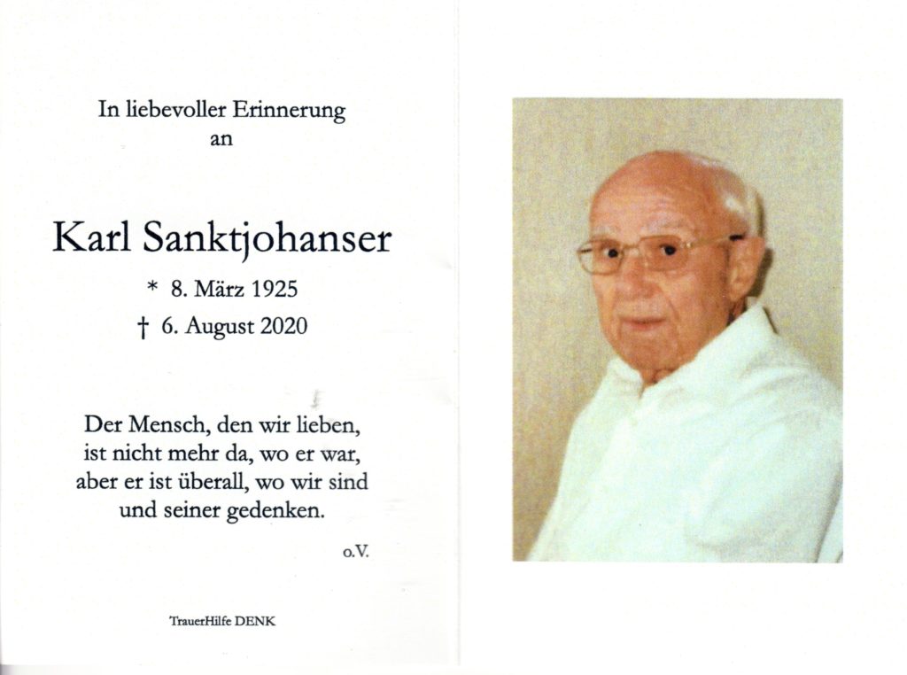Karl Sanktjohanser ist nach mehr als 50 Dienstjahren am 31. März 1990 in den Ruhestand getreten. Vom Lehrling zum Leiter der größten Betriebsabteilung – dass war seine Karriere. Von 1939 bis 1941 wurde Sanktjohanser bei der Thuringia ausgebildet. Anschließend war er Sachbearbeiter in HUK-Betrieb. 1959 wurde er stv. Abteilungsleiter und erhielt Handlungsvollmacht. Seit 1963 leitete er die K-Abt. 1964 wurde ihm Prokura und 1976 der Titel Abt. Dir. verliehen. Er war Sprecher unseres Stammtisches und bis kurz vor seinem Tod regelmäßiger Stammtisch-Besucher.